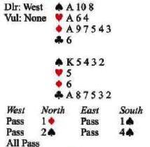 Afortunadamente, este Norte era miembro del club: «apoye a su compañero cada vez que sea posible». Le gustaron lo suficiente sus espadas, como apoyarlo con 2. Esto le hizo las cosas mas faciles. Habiendo ubicado un fit, UD reevaluo su mano tan distribucional y sin perder el tiempo salto a 4.