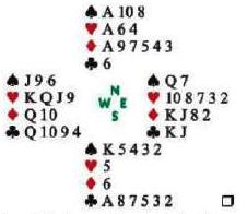 Espero que no haya empezado por sacar triunfos. Algunos jugadores podrían tratar de fallar cruzado los palos rojos del muerto y sus treboles. Debido a sus malas cartas intermedias de espadas y su longitud combinada en ambos palos menores, es probable que le sobrefallen en algún momento. Usted podría considerar afirmar los diamantes del muerto. Desafortunadamente, una vez que el A fue eliminado, incluso si los diamantes estan 3-3, UD carece de las entradas suficientes para volver a la mesa y finalmente correr los diamantes.