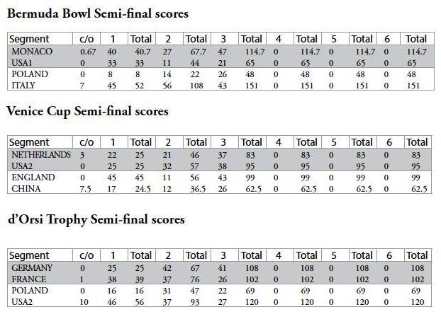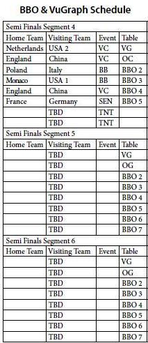 Como se esperaba la mayoria de los matchs de las semi-finales en la Bermuda Bowl, Venice Cup y d’Orsi Seniors Trophy son parejos, dos estan casi empatados y uno pareceria ya estar definido aunque faltan 48 tablillas por jugar. En Seniors, Alemania supera al campeon defensor Francia por solo 6 IMPs, y en la Venice Cup, USA2 supera en 12 IMPs a Holanda.