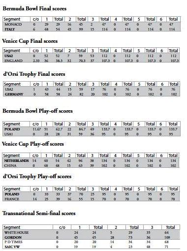 Mucho mas ajustado es lo que esta pasando en la Venice Cup y el d’Orsi Seniors Trophy. USA2 perdio 14-IMPs en la ultima tablilla del tercer set pero aun lidera 112-107.3 vs Inglaterra y en Seniors, Alemania esta arriba 102-76. En el World Transnational OpenTeams, Gordon (un equipo de USA) se enfrentara con SAIC VW en un final de 48-tablillas. Gordon derroto a White House (de Holanda) 109-64. SAIC VW a PD Times 71-68.