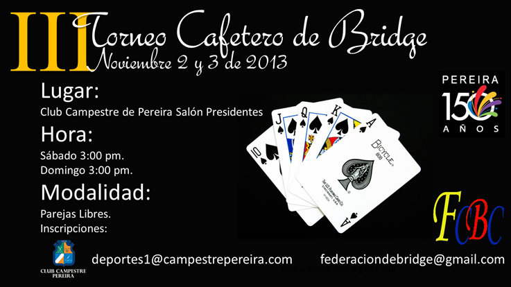 Invitación al III Torneo de Bridge, que se realizará en Pereira en conmemoración del Sesquicentenario de su fundación.
