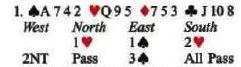 El atrapar honores o jugadas de «surrounding» son posibles hasta en la salida. Solo la salida desde un honor de diamante derrota el contrato de 3NT.