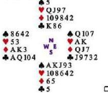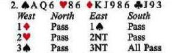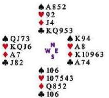 Sus treboles no son lo suficientemente prometedores como para salir: Este seguramente tiene treboles fuertes aquí. En cabio confie en sus diamantes, independientemente de la apertura de Oeste. Como UD probablemente va a encontrar A Q en el muerto trate con el J o el K.