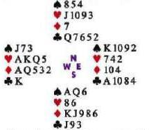 Los opps tuvieron una secuencia fuerte y ambos nombraron sus palos largos. UD debe asumir que Norte tiene algunos valores, sino la mano se dirimaira solo pos las sobre bazas, asi que es rasznable tratar de encontrar el palo largo de su compañero. Siel tuviera 5 o mas espadas hubiera sobre declarado 1, pero seria menos propenso a sobre declarar al nivel 2 su palo de trebol. Salga del 10.