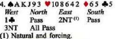 Los 2NT de Este prometen un stopper a espadas que debe ser la dama protegida guarded queen, pero Este nego tener 4 cartas de espadas. En cambio de salir a espadas y conceder una abza, trate de darle la mano a Norte para que él le vuelva una espada. Si Norte tiene una entrada por un palo menor, el podria ganar la salida a tiempo, pero cuidado si Este-Oeste tienen bazas que corren en los menores, UD debe salir a corazon. Comience con el 8, negado largo corazon. Si Norte toma la mano, UD quiere que él haga un cambio de palo.