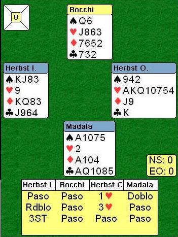 9 y cuando Bocchi jugo un corazon chico, nuevamente Herbst Ilan uso inferencias de la subasta para pasar la unica carta ganadora el