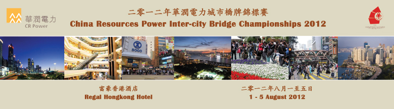 The China Resources Power Inter-city Bridge Championships 2012 was held at the Regal Hongkong Hotel from 1 to 5 August 2012. The Opening Ceremony was on Wednesday 1 August 2012 at 11:45. The China Resources Power Open, Inter-city Ladies and President’s Cup Youth Teamsround robins start on Wednesday 1st after the Opening Ceremony and finished on Friday 3rd, with the Play-offs on Friday 3rd. In addition to these main events, there were also 7 other championship events, including the Inter-city IMP Pairs, San Miguel “Happy Hour” Continuous Pairs, DBS Bank Swiss Team, Geely Automobile Open Pairs, Geely Automobile Swiss Pairs, Inter-city Mixed Pairs, Inter-city Speedball Pairs. The Closing Ceremony, with the prize presentation and a victory banquet, took place on Sunday 5th August.