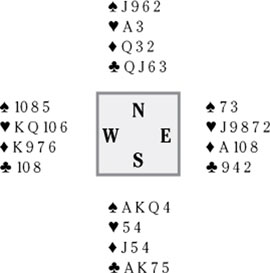 It wouldn’t have worked if you hadn’t taken all the opponents’ “out cards” from them by playing out your clubs after you pulled trumps. It was okay to play four rounds of clubs, but you didn’t want to play four rounds of trumps, because then you wouldn’t have had the opportunity to take advantage if an opponent played a heart.