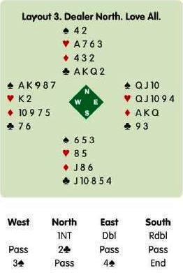confirming that he holds five clubs and now West pounces: double. East trusts his partner and declarer scrapes together five tricks – two ace-kings and one trump – three off is worth +500, which is more than 3NT making your way (+400).