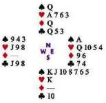 10 before playing a trump to dummy’s queen and East’s ace. East, however, delivered the killing blow by leading his last diamond: