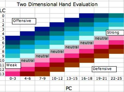 Mientras que la CP mide tanto la fortaleza defensiva como la fortaleza ofensiva, la LC mide la fuerza sobre todo en ataque. Así que si los adversarios obtienen el contrato o su lado tiene un misfit, usar la LC para evaluar la mano no es correcto. Usando la línea de base de la imagen de abajo, como uno en LC vale 3 en CP, podemos comparar el par real (CP, LC) para una mano y determinar si la mano es principalmente ofensiva o defensiva. La tabla que sigue es instructiva para evaluar el par (CP, LC) de una mano en particular: