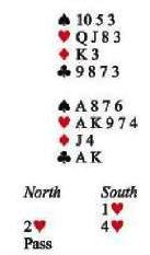 En esta mano, la crta intermedia clave es el 8. Si UD reconoce esto a tiempo, UD puede garantizar una segunda baza de espadas cubriendo el 9 con el 10. Hace un tiempo, mientras escribia un articulo sobre las cartas intermedias, me encontre con esta posicion de cartas:Sur juega NT y necesita dos bazas en este palo. Supongamos que sale jugando el 6 del muerto y Este juega el 2. Sur juega el 3 y Oeste gana con el 10. Cuando Sur retoma la mano y juega el as, cae el K, dejando a Sur con 9-8-7 y a Oeste con el Q-J-5. Sur puede continuar jugando el palo, ya que va a firmar otra baza.
