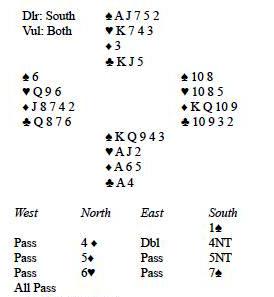 es un splinter que muestra singleton de diamante, y un apoyo fuerte a espadas mas valores de apertura. El doblo de Este, doblo a un canto artificial es para pedir salida a ese palo. Sur tiene una mano perfecta para jugar slam – no tiene nada desperdiciado en diamante – y cuando encuentra el