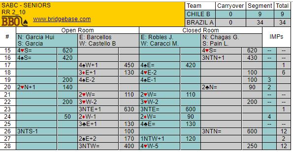El match se desarrollaba en forma tranquila y todo indicaba que los equipos no se sacarian mayor diferencia 9 IMPs a 8 en favor de Chile, sin embargo en las ultimas tres manos Brasil apretó el acelerador y termino imponiendose por un marcador de 34 a 9.