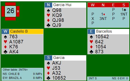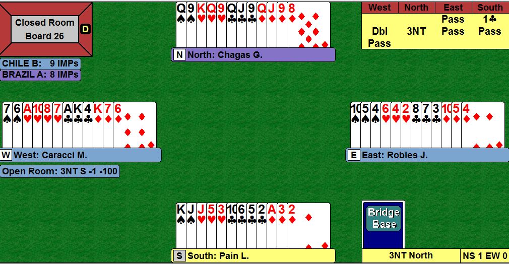 La mano 26 fue decisiva para Brasil. En la sala cerrada se enfrentaban por Brasil el WGM Gabriel Chagas y Leda Pain (WIN) contra Marcelo Caracci (GMS) y Jose Manuel Robles (GMS).
