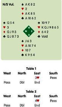 3 no hubiera evitado que hiciera 9 bazas, para anotar 600. Norte, sin embargo, tenia una mano casi máxima para un doblo de saque. La acción las segura para Sur era pasar, pero anotar 500 pierde el par de 600. En la mesa 2, sin tener en cuenta la regla, Este abrió de 4