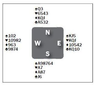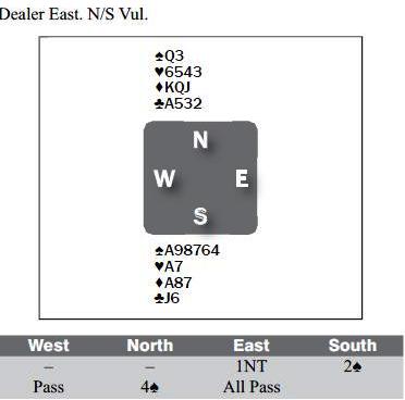 Norte no tiene buenas opciones, pero la dama-segunda como apoyo a triunfo muy seguido va a funcionar cuando el partner sobredeclara sobre 1NT (15-17) en vulnerable, y declara el game. Como planea su carteo cuando Oeste sale del